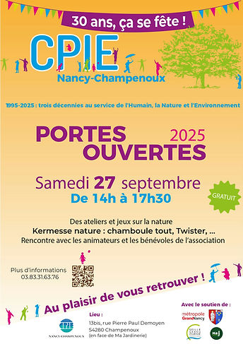 Pour célébrer ses trois décennies d'engagement, le CPIE Nancy-Champenoux organise une journée portes ouvertes le samedi 27 septembre 2025, de 14h00 à 17h30, à Champenoux.